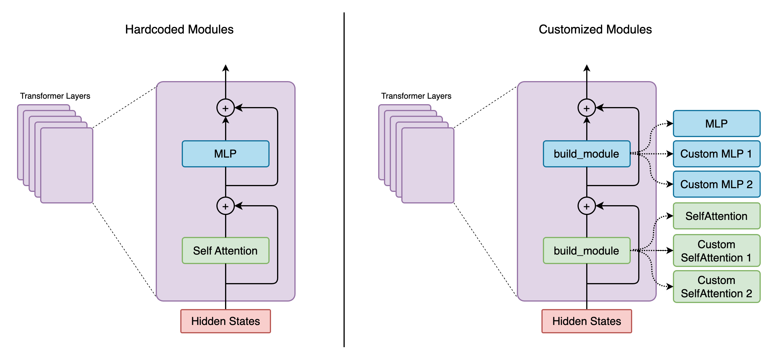 Let’s take layer initialization as an example. GPTModel passes the layer spec and the provided configs to TransformerBlock and layers are built using build_module. Mcore GPTModel uses gpt_layer_with_transformer_engine_spec shown in the example above. According to the spec, module=TransformerLayer says the TransformerLayer class should be initialized with provided configs and the TransformerLayerSubmodules. Inside the TransformerLayer.__init__, layer submodules are built using build_module.