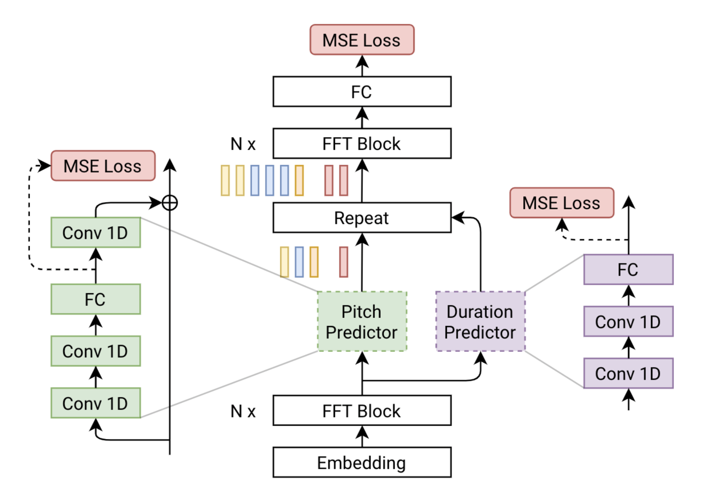 FastPitch is a fully-parallel text-to-speech synthesis model based on FastSpeech, conditioned on fundamental frequency contours. The model predicts pitch contours during inference. By altering these predictions, the generated speech can be more expressive, better match the semantic of the utterance, and in the end more engaging to the listener. Uniformly increasing or decreasing pitch with FastPitch generates speech that resembles the voluntary modulation of voice. Conditioning on frequency contours improves the overall quality of synthesized speech, making it comparable to the state of the art. It does not introduce an overhead, and FastPitch retains the favorable, fully-parallel Transformers architecture, with over 900x real-time factor for mel-spectrogram synthesis of a typical utterance. The architecture of FastPitch is shown below. It is based on FastSpeech and consists of two feed-forward Transformer (FFTr) stacks. The first FFTr operates in the resolution of input tokens, and the other one in the resolution of the output frames. Please refer to [TTS-MODELS12] for details.