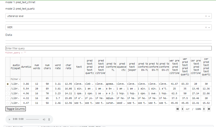 To compare models at utterance level, pick it at top dropdown field.