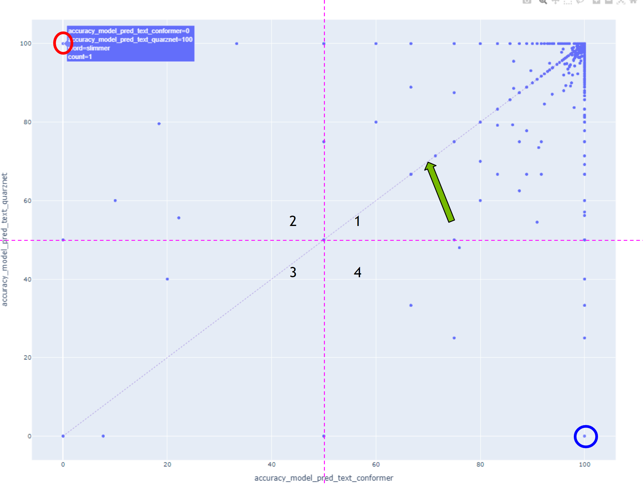 In this case, all points lying above the diagonal have higher accuracy with the model displayed on the vertical axis, and all points below the diagonal were recognized better with the model displayed on the horizontal axis.
