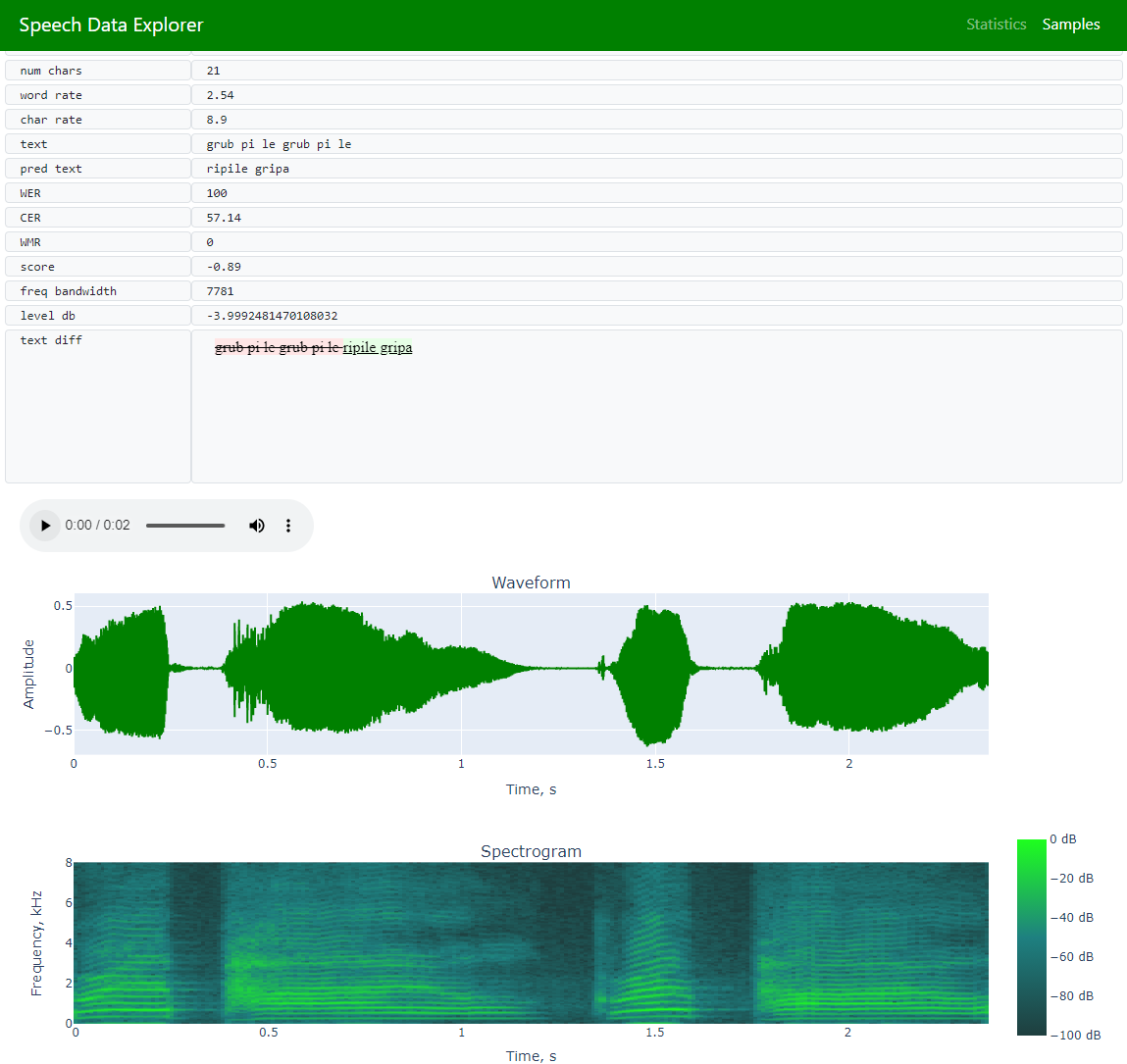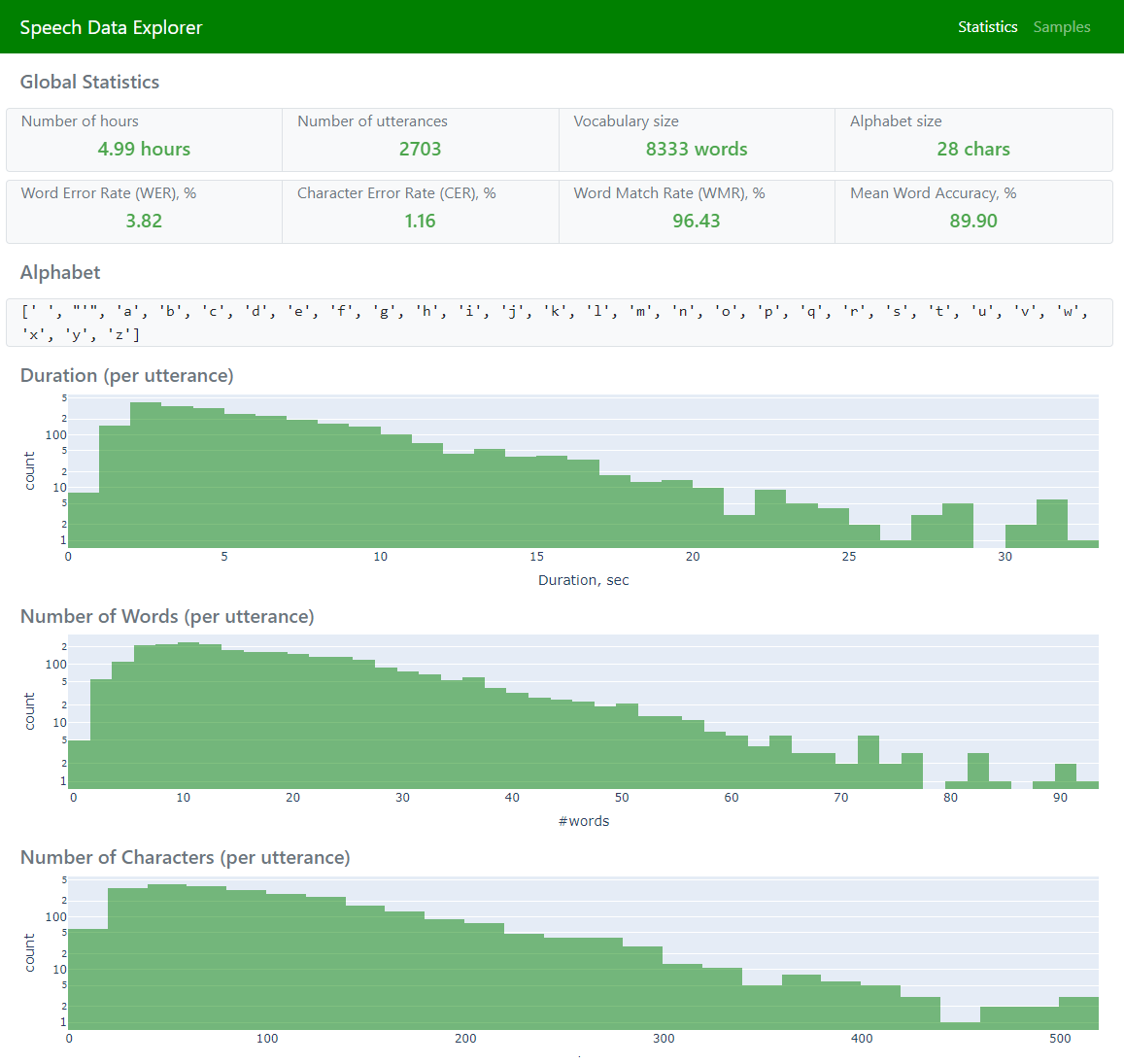 • Samples (to allow navigation across the entire dataset and exploration of individual utterances)