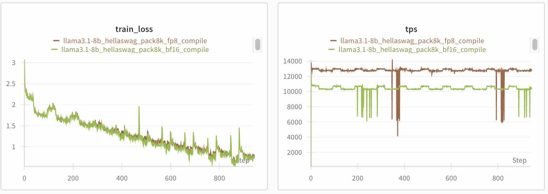 FP8 quantization provides measurable performance improvements while maintaining model convergence: