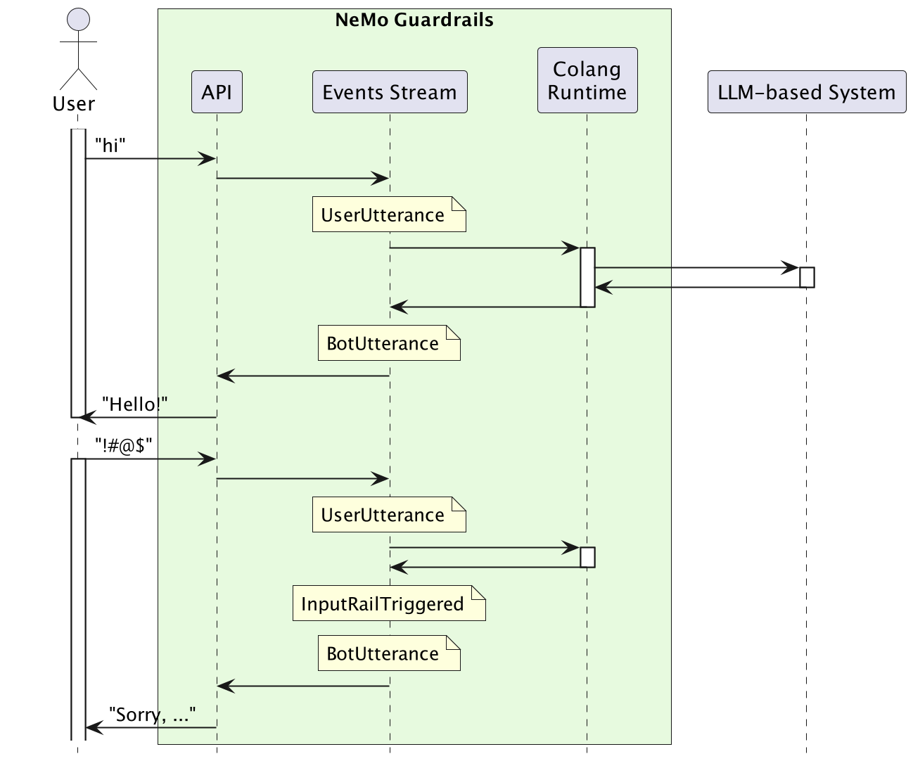 This event-driven interaction model is part of what makes Colang a powerful modeling language, enabling the description of any type of interaction (text-based, voice-based, multi-modal, agent, multi-agent, etc.) and adding guardrails to it.