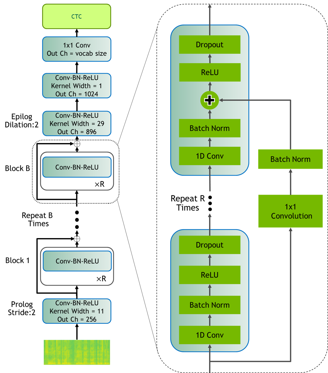 blocks of 1D-convolutional layers. The Jasper family of models are denoted as Jasper_[BxR] where B is the number of blocks