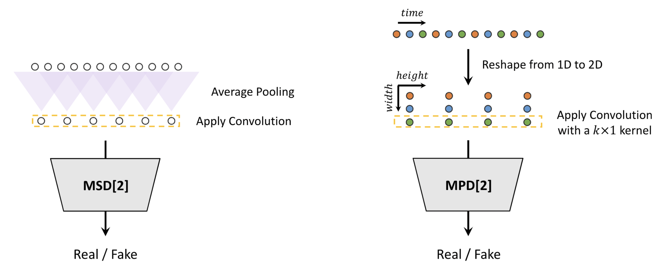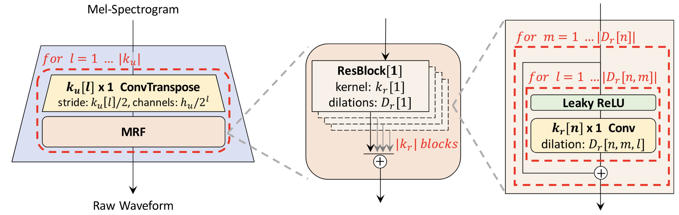 HiFi-GAN focuses on designing a vocoder model that efficiently synthesizes raw waveform audios from the intermediate mel-spectrograms. It consists of one generator and two discriminators (multi-scale and multi-period). The generator and discriminators are trained adversarially with two additional loses for improving training stability and model performance. The generator is a fully convolutional neural network which takes a mel-spectrogram as input and upsamples it through transposed convolutions until the length of the output sequence matches the temporal resolution of raw waveforms. Every transposed convolution is followed by a multi-receptive field fusion (MRF) module. The architecture of the generator is shown below (left). Multi-period discriminator (MPD) is a mixer of sub-discriminators, each of which only accepts equally spaced samples of an input audio. The sub-discriminators are designed to capture different implicit structures from each other by looking at different parts of an input audio. While MPD only accepts disjoint samples, multi-scale discriminator (MSD) is added to consecutively evaluate the audio sequence. MSD is a mixer of 3 sub-discriminators operating on different input scales (raw audio, x2 average-pooled audio, and x4 average-pooled audio). HiFi-GAN could achieve both higher computational efficiency and sample quality than the best publicly available auto-regressive or flow-based models, such as WaveNet and WaveGlow. Please refer to [TTS-MODELS2] for details.