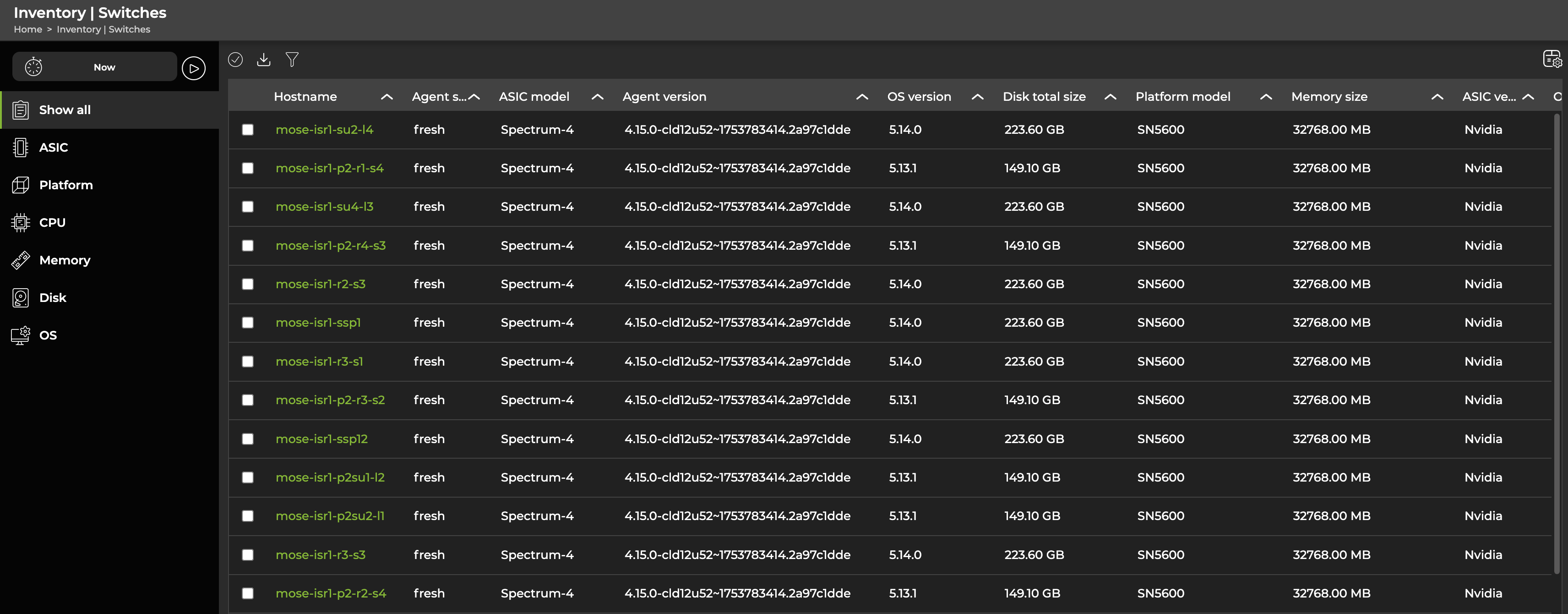 Expand the Inventory/Switches card to full-screen to view, filter or export information about ASICs, motherboards, CPUs, memory, disks, and operating system. You can right-click the hostname of a given switch to open a monitoring dashboard for that switch in a new tab.