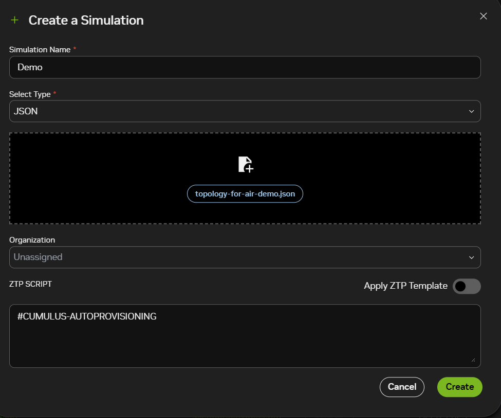 When you create a new simulation, Air gives you the option to add a zero-touch provisioning (ZTP) script. The ZTP script is copied to the simulation’s oob-mgmt-server