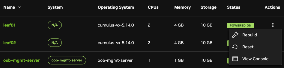 From a loaded simulation, click the hamburger menu on a node to view rebuild and reset options.