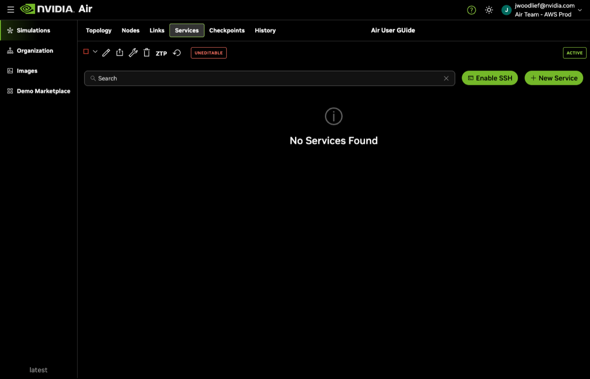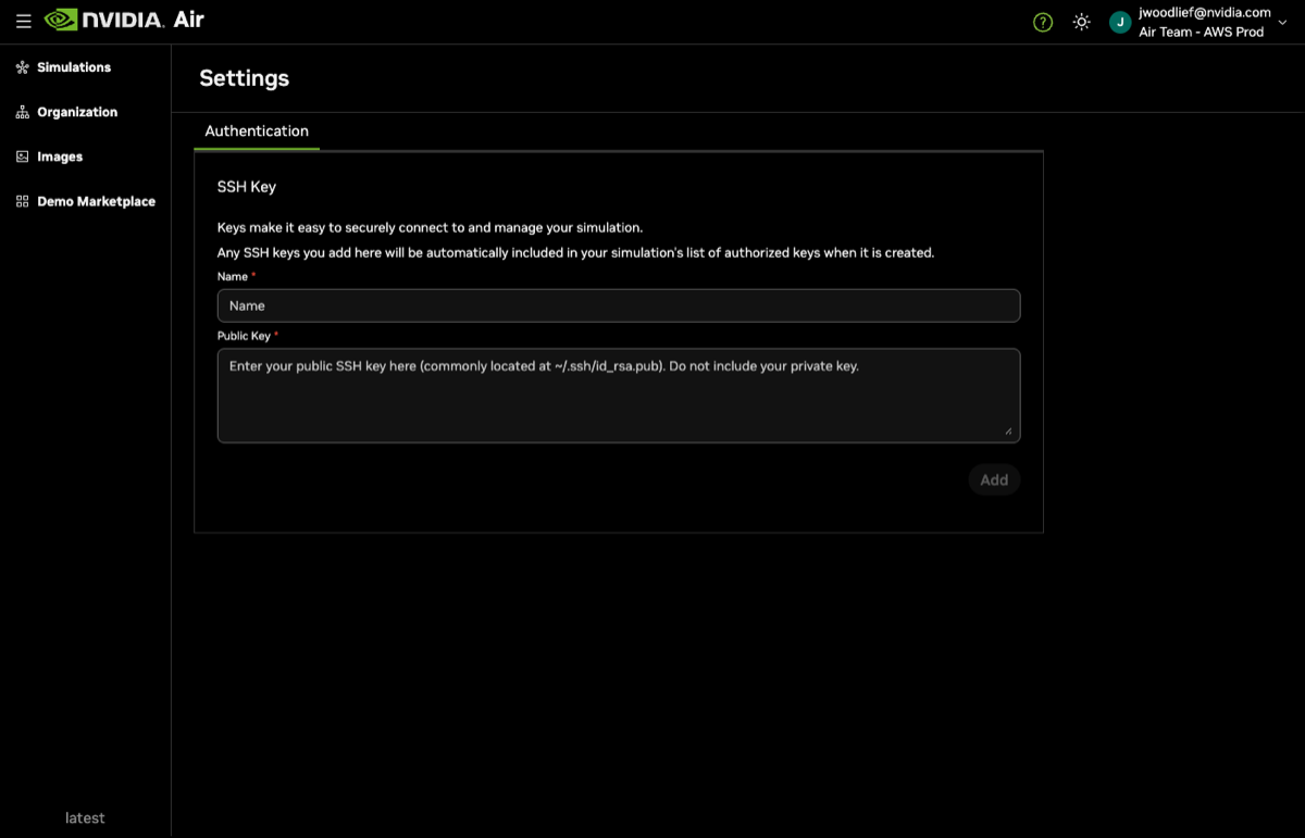 To view your SSH keys, click your username in the UI and select Settings. To enable the SSH service on simulations, you must add SSH keys to your authentication settings. Any SSH keys that you add are included automatically in your simulation’s list of authorized keys under the oob-mgmt-server.