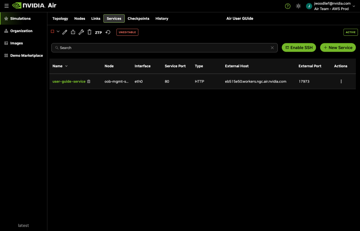 eth0on theoob-mgmt-server. - Service Type is the service type. NVIDIA Air creates a hyperlink to the URL automatically in the services panel for SSH, HTTP, or HTTPS services. For Other services, you can use any port, but Air does not generate a hyperlink. The hyperlink provides a convenient way to copy and paste the service if your browser supports it.