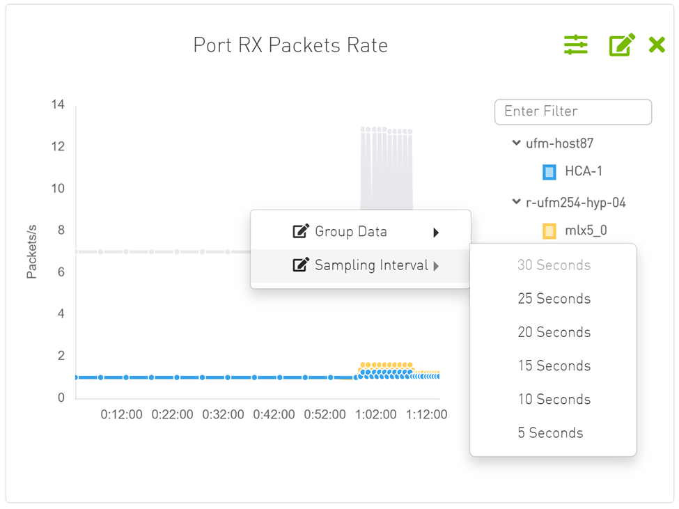 Telemetry supports two types of panels, time-series which show the relationship between time and counter value for a specific device, and topX, which show all ports with pick by counter greater than topX value.