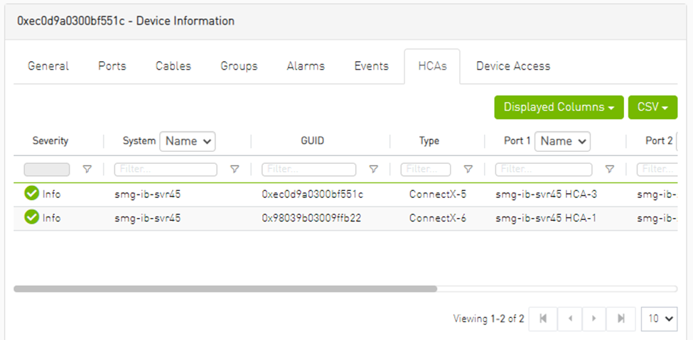 This tab provides a list of the device’s HCAs with information in a tabular format.