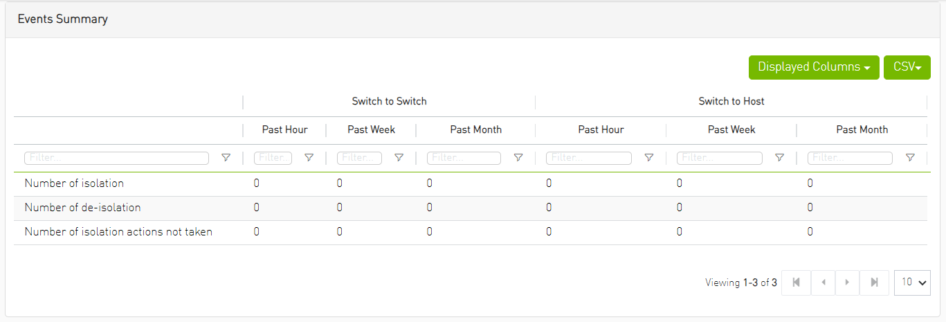Number of isolated ports in the past hour, week, and month for ‘host to switch’ and ‘switch to switch’.