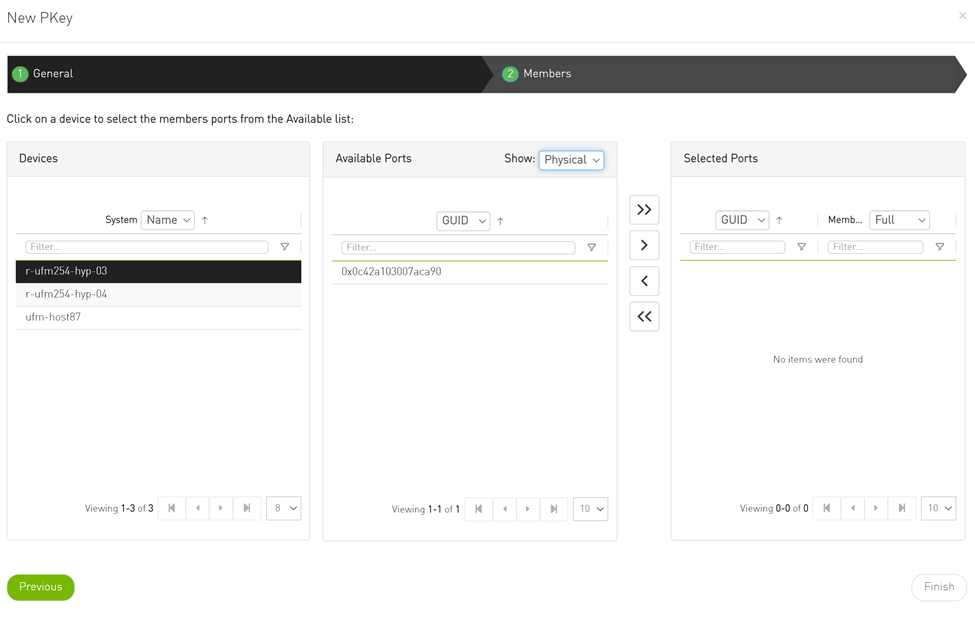 Under Members tab, select the device of which ports you would like to group in one PKey, and move the members (ports) from the Available list to the Selected list. For each member (port) you may specify a membership type (Full/limited).