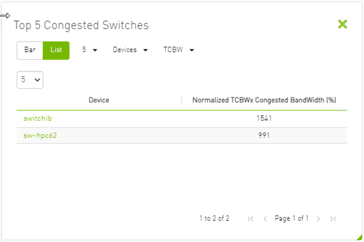 The Top N Congested devices by Rx or Tx Bandwidth component shows the top congested devices, classified top-down according to the defined Transmit (Tx) or Receive (Rx) bandwidth.