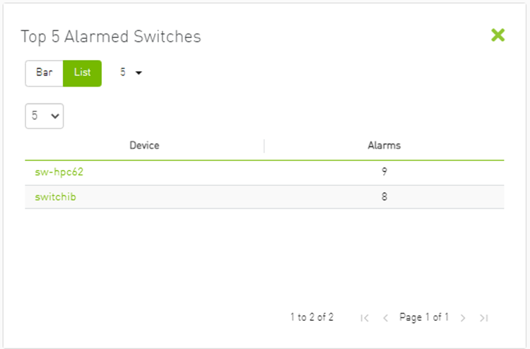 Shows the top N alarmed servers/switches as a list. Each alarmed device is shown in a row with the name of the node and the number of alarms. |
