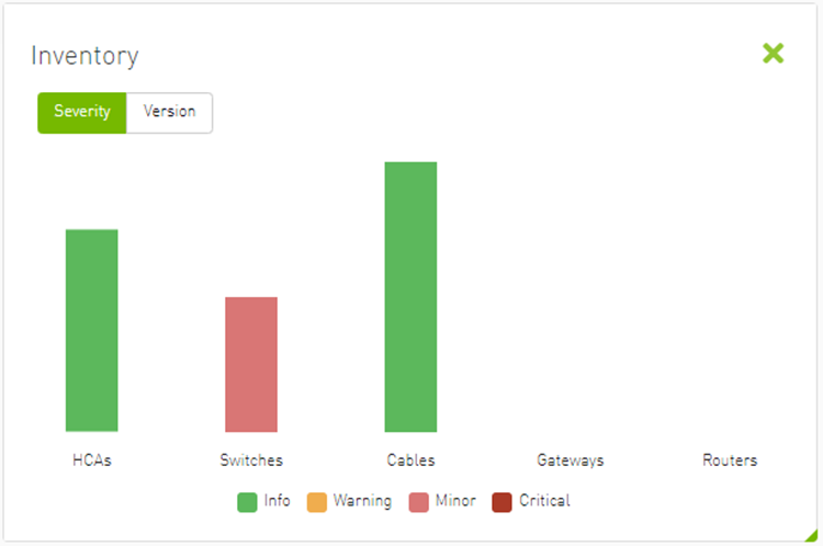 The Fabric Inventory Summary component shows a summary of your fabric inventory (HCAs, Switches, Gateways, Routers and Cables) categorized by the element’s severity or firmware version.