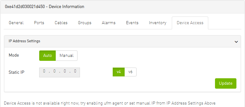 This tab allows for managing the access credentials of the selected device for remote accessibility. To be able to set access credentials for the device, a device IP must be set either by installing UFM Agent on the device, or by manually setting the IP under IP Address Settings (IP is now supported with v4 and v6).