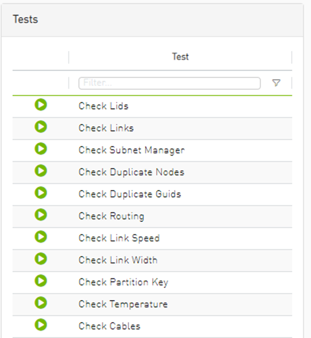 The Fabric Validation tab displays the fabric validation tests and gives the ability to run the test and receive/view the summary as a job output. Summary of the job contains all errors and warnings that were found during the test execution.