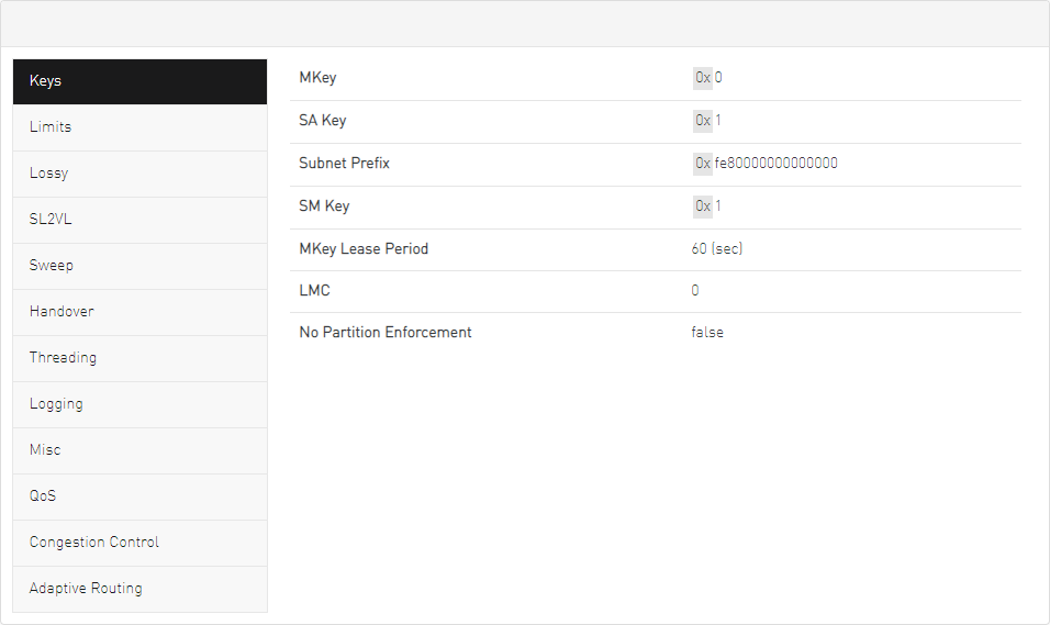 The SM Keys tab enables you to view the Subnet Manager Keys. You cannot change the configuration in this tab.