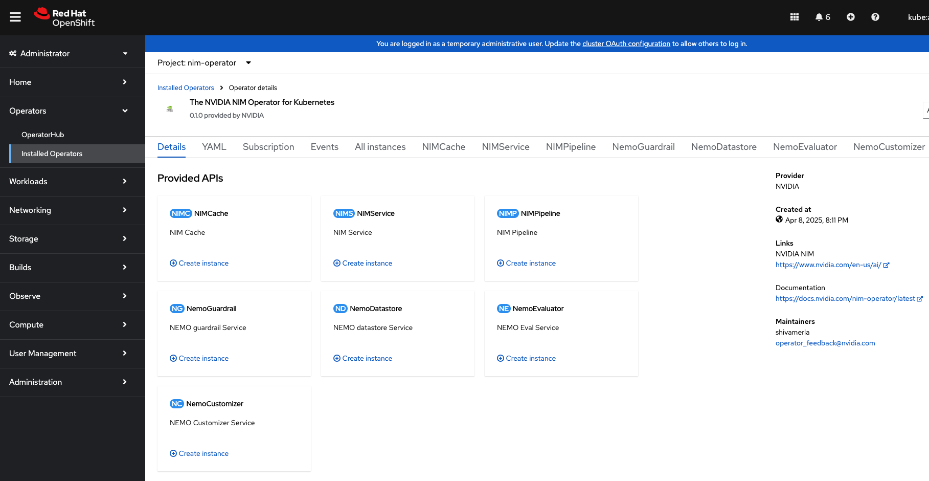Verify the NIM Operator is installed, navigate to Operators > Installed Operator. The NVIDIA NIM Operator for Kubernetes should be listed. Click on NVIDIA NIM Operator for Kubernetes to view details about the NIM Operator.