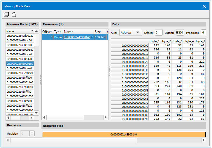 The left-most pane contains information about all device memory objects currently allocated. Once a device memory object is selected, the contained resources will be listed in the middle pane, along with the resource layout map in the bottom left, and contained data on the right.