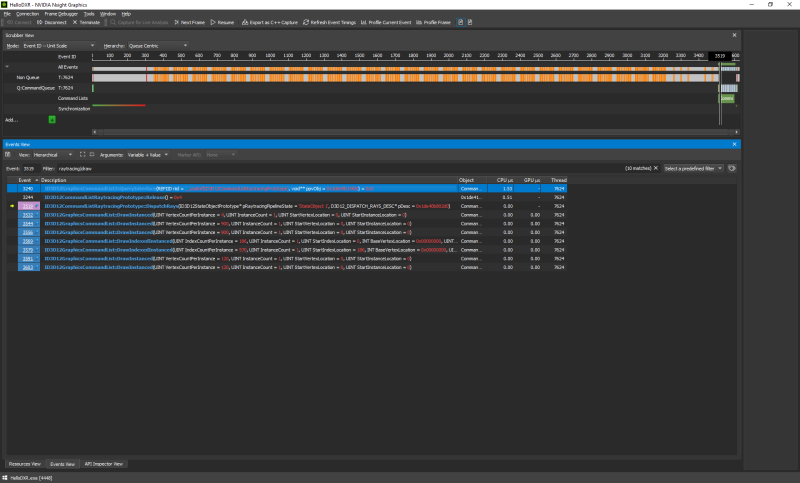 DXR is an addition to the core Direct3D12 API, and as such the Frame Debugger naturally supports many existing facilities, including live frame capture, HUD display, Scrubber, Linked Programs view, Events list and Resources view.