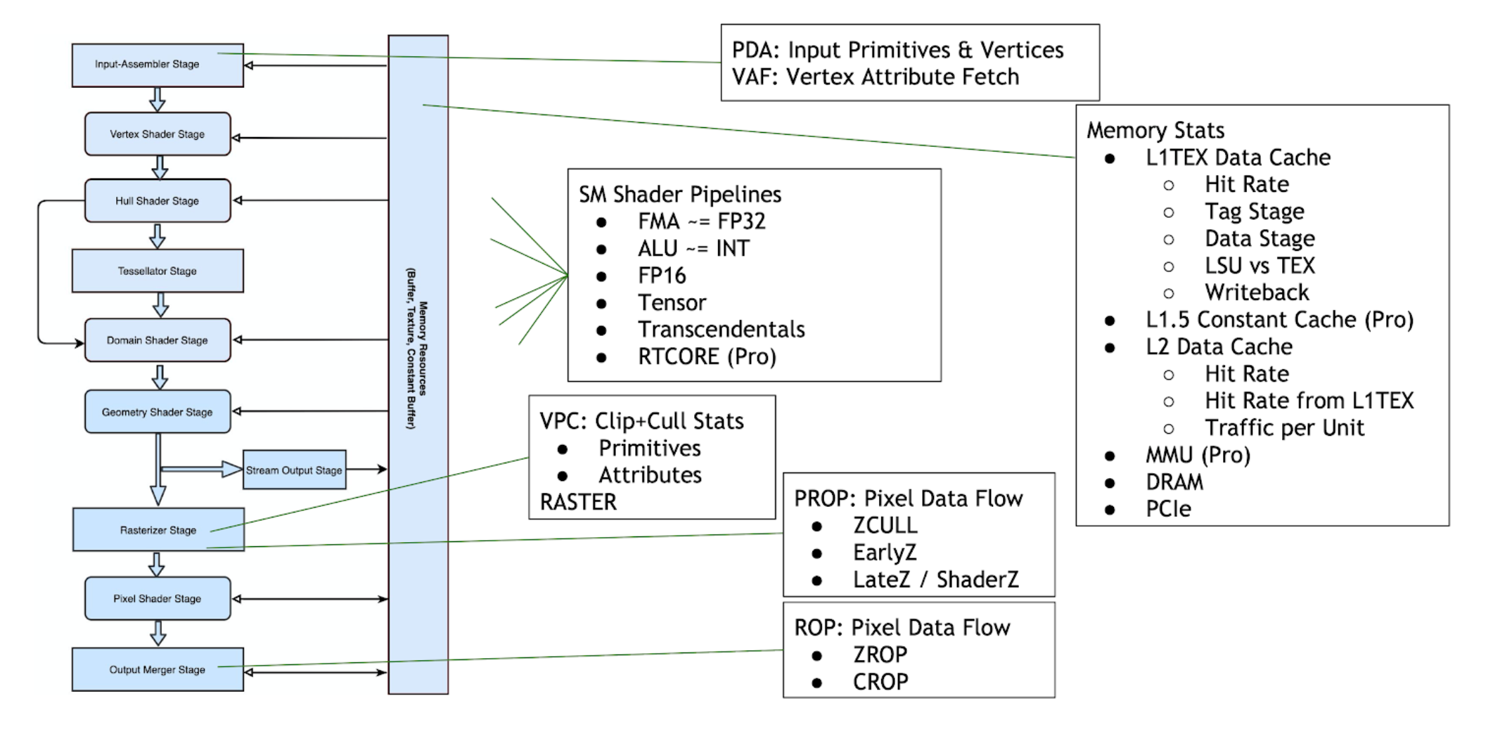 GPU Trace allows you to observe metrics across all stages of the D3D12 and Vulkan graphics pipeline. The following diagram names the NVIDIA hardware units related to each logical pipeline state:
