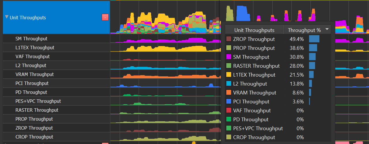 The Unit Throughputs row overlays the %-of-max-throughput of every hardware unit in the GPU. Multiple units can concurrently reach close to 100% at any moment in time.