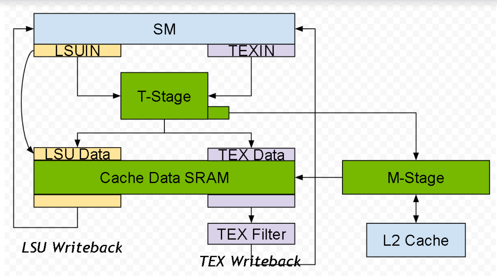 Local/Global/Texture/Surface→ T-Stage [miss!] → M-Stage → XBAR → L2 → XBAR → M-Stage → Cache Data SRAM