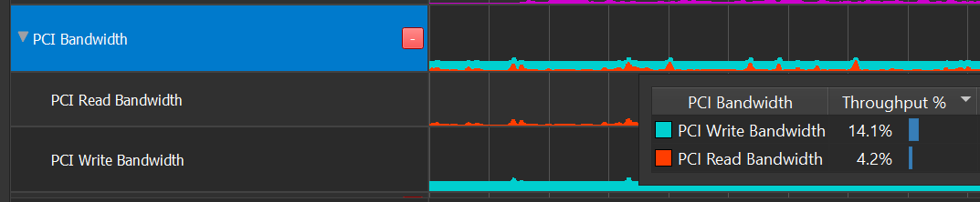 The GPU connects to the rest of the computer via PCI Express (PCIe). PCIe is a full duplex interface, meaning separate wires are used for reads and writes, and these can occur simultaneously. This is why the PCIe row is displayed as an overlay, where reads and writes can independently reach 100%.