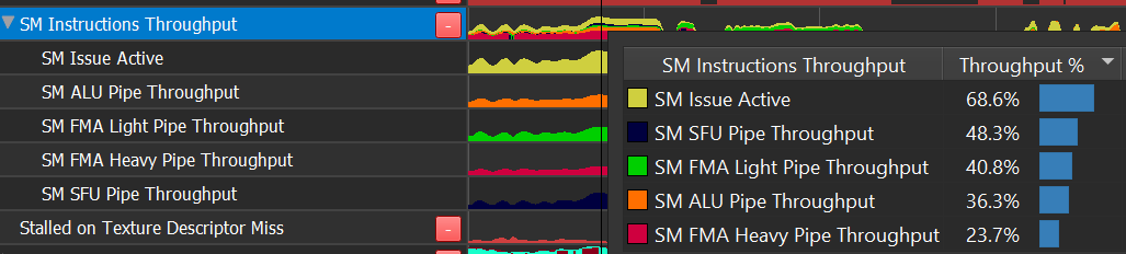 SM Throughput reveals the most common computational pipeline limiters in shader code: