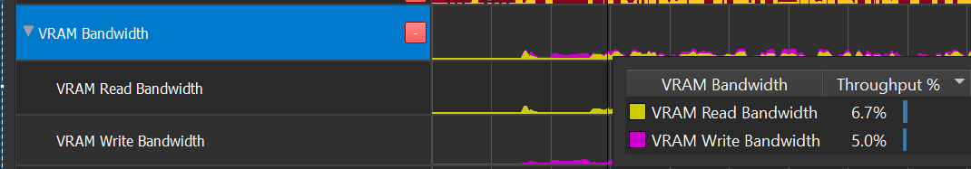 The VRAM Bandwidth row shows bandwidth as a stacked graph, making it easy to visualize the balance between read and write traffic. VRAM traffic implies either L2 cache misses, or L2 writeback. In either case, high VRAM traffic can be a symptom of poor L2 cache usage — either too large a working set, or sub-optimal access patterns.