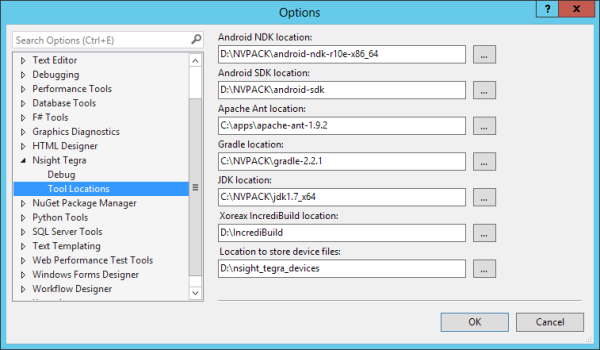 The Nsight Tegra options can be accessed either through the Tools > Options menu, by selecting the Tegra > Options... menu item, or by clicking the corresponding button in the toolbar.