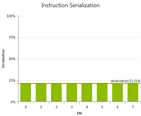 The difference between the number of issued instructions versus executed instructions are the number of instruction replays (see the background section of this document for more details). The metric of Instruction Serialization details on this relation. It is defined as the ratio of required instruction replays over the total number of issued instructions. The relation can also be expressed as: (Instructions Issued - Instructions Executed) / Instructions Issued Lower values are better. Memory address divergence and bank conflicts are the most common causes of high instruction serialization. |