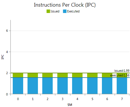 A z-ordered column graph showing the achieved instructions throughputs per SM for both, issued instructions and executed instructions. The theoretical maximum peak IPC is a device limit and defined by the compute capabilities of the target device. The y-axis is scaled to this peak value. The peak IPC value is the maximum number of executed instructions achievable on a single cycle. The maximum sustainable executed IPC might be lower. MetricsIssued IPC The average number of issued instructions per cycle accounting for every iteration of instruction replays. Optimal if as close as possible to the Executed IPC. As described in the background section of this document, some assembly instructions require to be multi-issued. Hence, the instruction mix affects the definition of the optimal target for this metric. Executed IPC The average number of executed instructions per cycle. Higher numbers indicate more efficient usage of the available all resources. Keep in mind that the reported values are given per multiprocessor. As each warp scheduler of a multiprocessor can execute instructions independently, a target goal of executing one instruction per cycle means executing on average with an IPC equal to the number of warp schedulers per SM. The maximum achievable target IPC for a kernel is dependent on the mixture of instructions executed. |