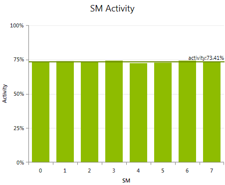 Shows the percentage of time each multiprocessor was active during the duration of the kernel launch. A multiprocessor is considered to be active if at least one warp is currently assigned for execution. An SM can be inactive - even though the kernel grid is not yet completed - due to high workload imbalances. Such uneven balancing between the SMs can be caused by a few factors: Different execution times for the kernel blocks, variations between the number of scheduled blocks per SM, or a combination of the two. The observable result of a load imbalance are highly different activity values across the multiprocessors; simply caused by the fact that some SMs are still busy executing work, while others SMs already completed their share of work and stay idle as no more work items are left to be scheduled. This is typically referred to as a Tail Effect. Small kernel grids with a low number of blocks are more likely to be affected by a tail effects. Concurrent Kernel Execution can utilize the idle multiprocessors for processing a subsequent kernel launch. As profile activities observe each kernel launch in isolation, the profile results can only indicate the existence of a tail effect. To analyze the effectiveness of concurrent kernel execution run a CUDA trace activity. |