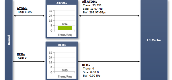 Nsight distinguishes between two classes of operations for atomic functions: Standard atomic operations (ATOMs) return the data value before the atomic operation is applied back to the calling thread. Consequently data traffic is generated in two directions, to and from the L1 cache. In contrast, reductions (REDs) do not have a return value and data is only communicated from the warps to L1. The Source View page can be used to investigate which type of operation is used by the compiler.