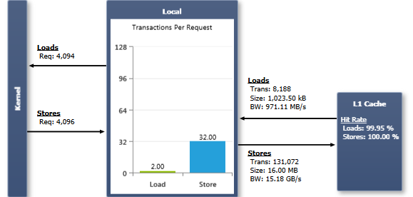 On devices of compute capability 2.x and higher, all local memory accesses are always cached in L1 and L2. The output of this experiment shows all local memory traffic as generated during the execution of the kernel.