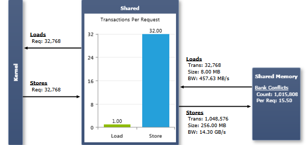The number of Load/Store Requests equals the amount of shared memory instructions executed. When a warp executes an instruction that accesses shared memory, it resolves the bank conflicts as discussed previously. Each bank conflict forces a new memory transaction. The more transactions are necessary, the more unused words are transferred in addition to the words accessed by the threads, reducing the instruction throughput accordingly. Each memory transaction also requires the assembly instruction to be issued again; causing instruction replays if more than one transaction is required to fulfill the request of a warp. More details on instruction replays and their performance implications are described in the context of the Instruction Statistics experiment. The Transactions Per Request chart shows the average number of shared memory transactions required per executed shared memory instruction, separately for load and store operations. Lower numbers are better; the target for a single shared memory operation on a full warp is 1 transaction for both, a 4byte access and an 8byte access, and 2 transactions for a 16byte access. Note that the ideal number of transactions for a given access pattern is dependent on the width of the access, the configured address mode (if available), and the target compute capability. Refer to the Ideal Shared Memory Transactions of the Memory Transactions experiment to tell the lowest number of transfers possible for a given instruction. The Transaction Size for shared memory traffic is 128 bytes for compute capability 2.x and 256 bytes for compute capability 3.x. For both devices classes the bandwidth is equal to one transaction per clock per SM. |