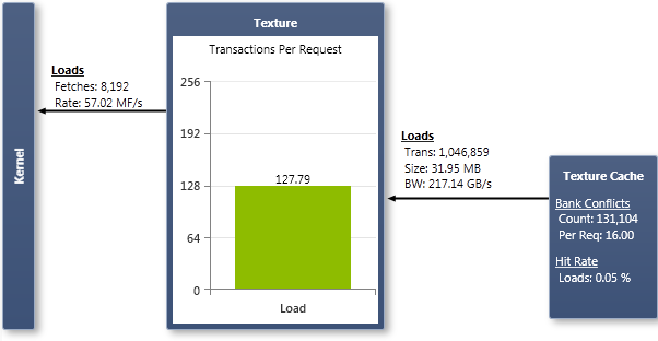 TextureEach time a warp executes a texture function to read from texture memory, this counts as a single fetch. The Texture chart shows the number of fetches and the fetch rate. A texture fetch is a memory request, which incurs transactions from the texture cache. Transactions from the texture cache are 32 byte units.
