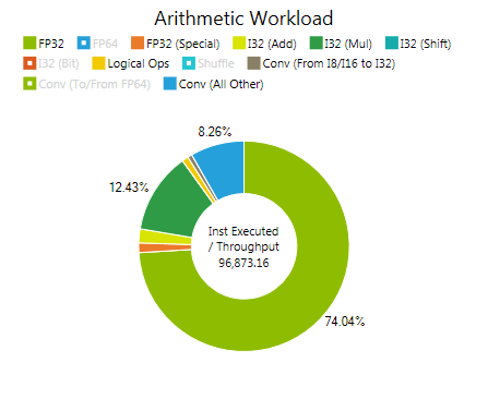 By definition the instruction throughput states how many operations each SM can process per cycle. In other words, an operation with a high throughput poses less cost to issue than an operation with a lower instruction throughput. The Arithmetic Workload uses this simplistic cost model by weighting issued instruction counts with the corresponding reciprocal instruction throughput. Doing so allows evaluating which type of arithmetic instruction poses how much of an overall processing cost. This is especially useful for kernels with a high arithmetic pipeline utilization to identify which class of arithmetic operations might have hit the available throughput limit.
