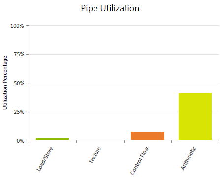 Shows the average utilization of the four major logical pipelines of the SMs during the execution of the kernel. Useful for investigating if a pipeline is oversubscribed and therefore is limiting the kernel's performance. Also helpful to estimate if adding more work will scale well or if a pipeline limit will be hit. In this context adding more work may refer to adding more arithmetic workload (for example by increasing the accuracy of some calculations), increasing the number of memory operations (including introducing register spilling), or increasing the number of Active Warps per SM with the goal of improving instruction latency hiding. The reported values are averages across the duration of the kernel execution. A low utilization percentage does not guarantee that the pipeline was never oversubscribed at some point during the kernel execution. MetricsLoad / Store