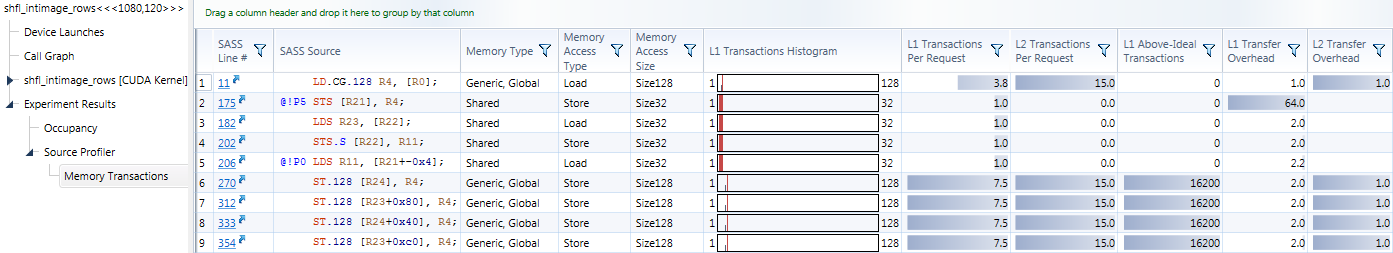 The Memory Transactions source-level experiment provides detailed statistics for each instruction that performs memory transactions. If a kernel is limited by memory bandwidth, fixing inefficient memory access can improve performance. This experiment makes it easy to find which instructions are making memory accesses that incur large numbers of transactions, and could potentially be improved. Patterns to start optimizing first are those which transfer more bytes than are requested, or incur more transactions than the ideal number.