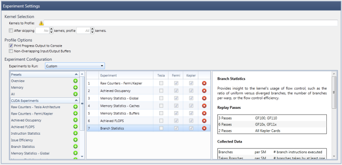 The CUDA Profiler allows the user to collect an arbitrary number of experiments per kernel launch. Each profile experiment may require the target kernel to be executed one or more times in order to collect all of the required data. In the following examples, the individual iterations of a profile experiment are referred to as Experiment Passes. Executing all passes of all experiments for a target kernel launch is handled transparently to the analyzed application.
