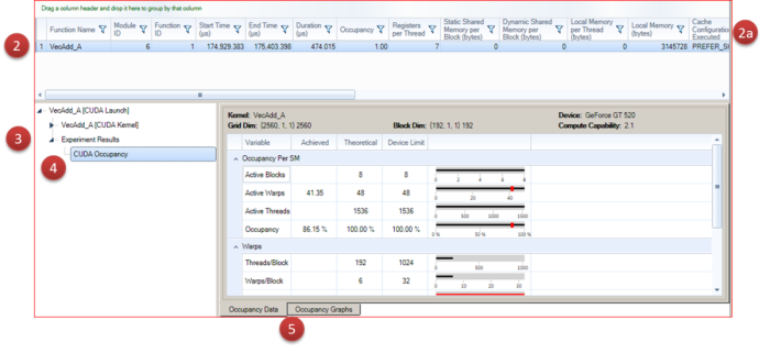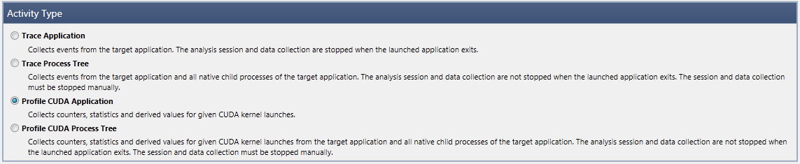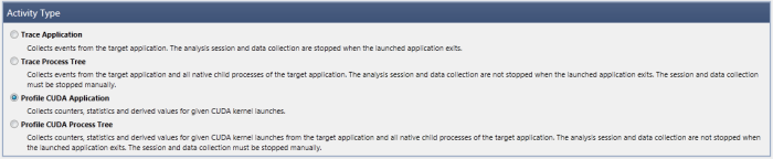 A CUDA Profiler activity consists of a kernel filter and a set of profiler experiments. Profile experiments are directed analysis tests targeted at collecting in-depth performance information for an isolated instance of a kernel launch.