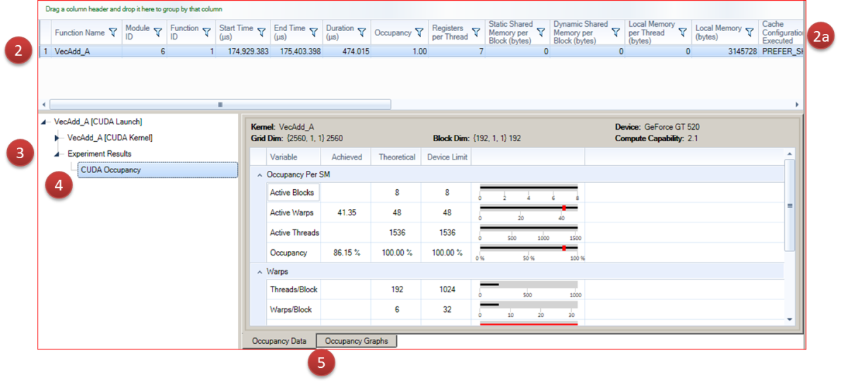 The NVIDIA Nsight Analysis tools contain a CUDA Profiler Activity that allows you to gather detailed performance information, in addition to timing and launch configuration details.