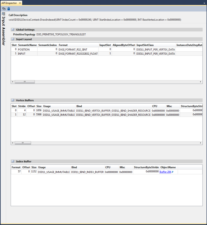 The Input Assembler page (shown above) shows the details of your vertex buffers and index buffers, the input layout of the vertices.