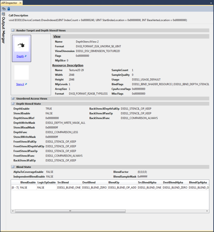 - OM — Shows the Output Merger parameters, including blending setup, depth, stencil, render target views, etc.