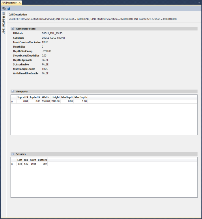 - RS — Shows the Rasterizer State parameters, including culling mode, scissor and viewport rectangles, etc.
